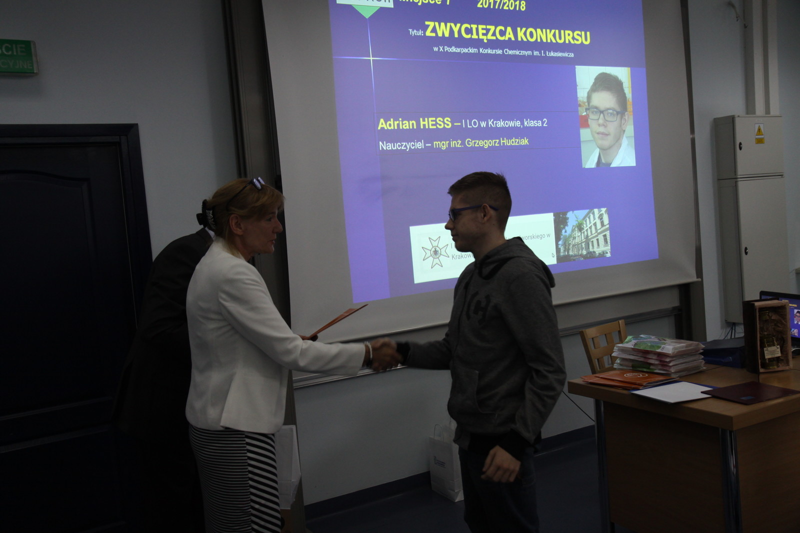 W spotkaniu wzięli udział między innymi: dr hab. inż. Mariusz Oleksy, prof. PRz, prorektor PRz ds. rozwoju i kontaktów z gospodarką, prof. dr hab. inż. Dorota Antos, dziekan Wydziału Chemicznego, dr hab. inż. Mirosław Tyrka, prof. PRz, prodziekan ds. nauki, dr inż. Joanna Wojturska, prodziekan ds. kształcenia, dr inż. Dorota Głowacz-Czerwonka, prodziekan ds ogólnych, prof. Jan Kalembkiewicz, przewodniczący Oddziału Rzeszowskiego Polskiego Towarzystwa Chemicznego a zarazem przewodniczący Zespołu Merytorycznego konkursu, Mariusz Rzucidło, dyrektor zarządu firmy Specjalistyczna Chemia Przemysłowa w Rzeszowie, finaliści konkursu i ich rodziny, nauczyciele, przedstawiciele dyrekcji szkół oraz członkowie Komitetu Organizacyjnego Konkursu.