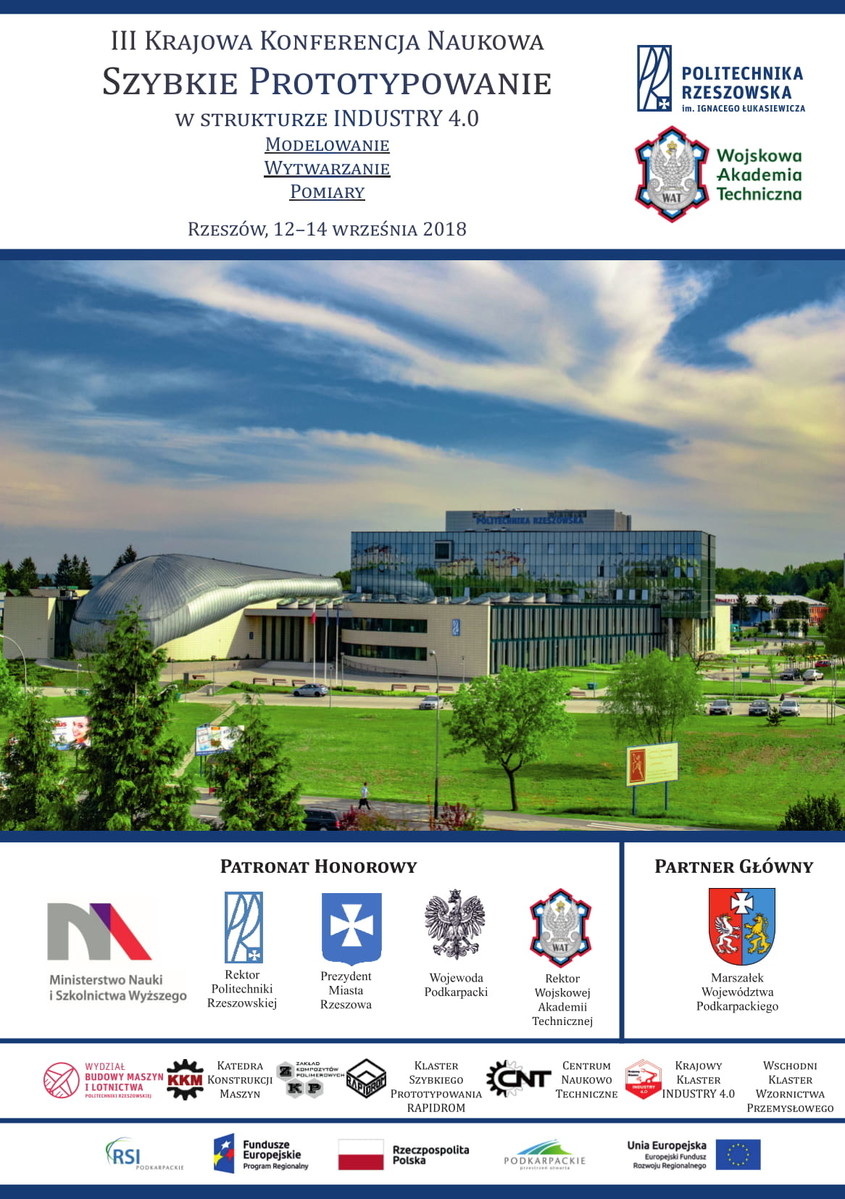Politechnika Rzeszowska oraz Wojskowa Akademia Techniczna zapraszają do udziału w III Krajowej Konferencji Naukowej Szybkie Prototypowanie Modelowanie – Wytwarzanie – Pomiary w Strukturze Przemysłu 4.0. Odbędzie się ona od 12 do 14 września w Politechnice Rzeszowskiej, bud. V, al. Powstańców Warszawy 12.